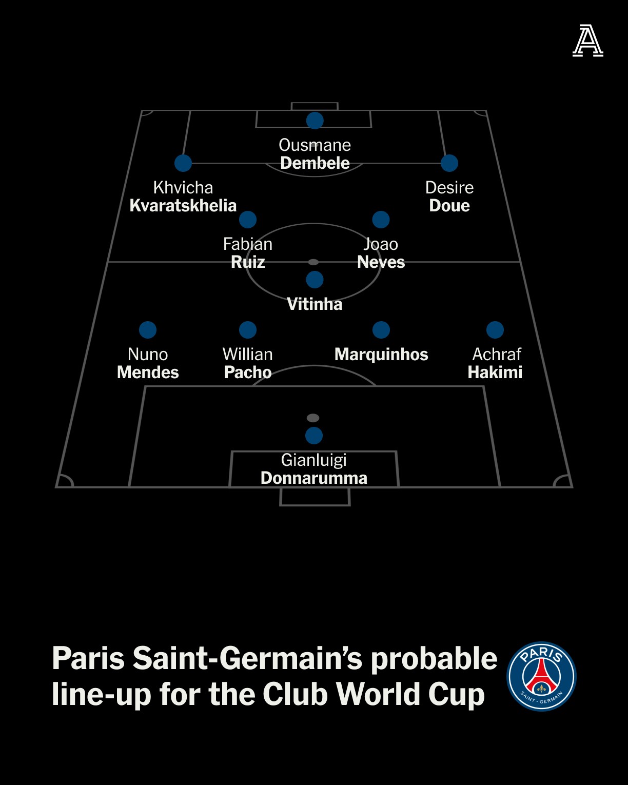 巴黎圣日耳曼采用4-3-3阵型。在大多数比赛中,进攻端没有固定支点。登贝莱可能首发居中,但他会频繁回撤或拉边,有时会与边锋互换位置。球队的高位压迫凶猛且协调有序。由维蒂尼亚坐镇的中场提供了稳定性和控制力。两名边后卫都被允许前插助攻,不过速度狂魔阿什拉夫通常在进攻三区更具影响力。